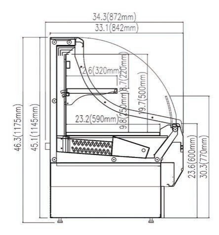 | Model | External Dimension (W*D*H)(INCH) | Temperature Range(F) | Efective Volume(C.F) | Display Area(M²) | Input Power(W) | Refrigerant | 40'Container loading(PCS) | ||